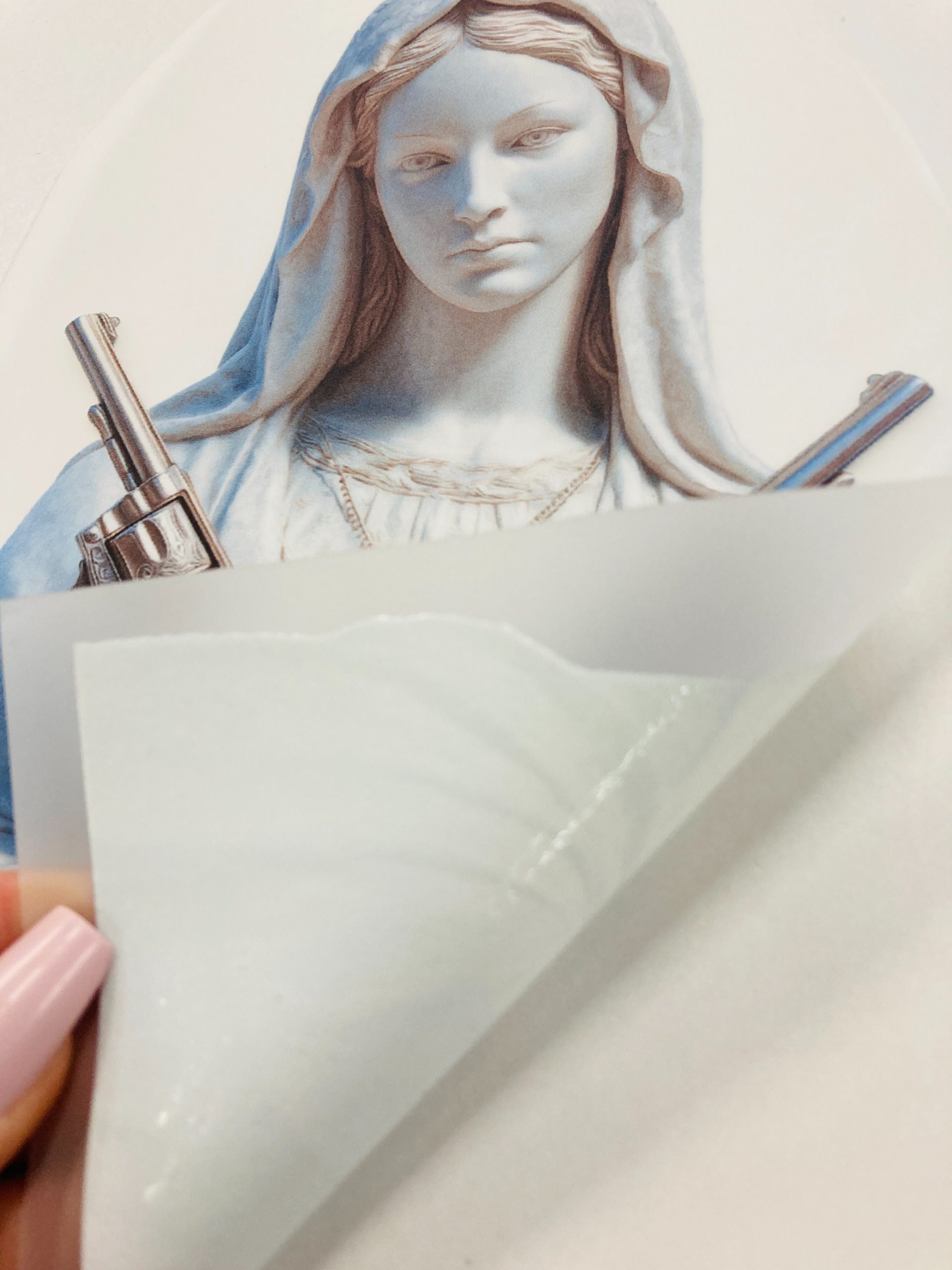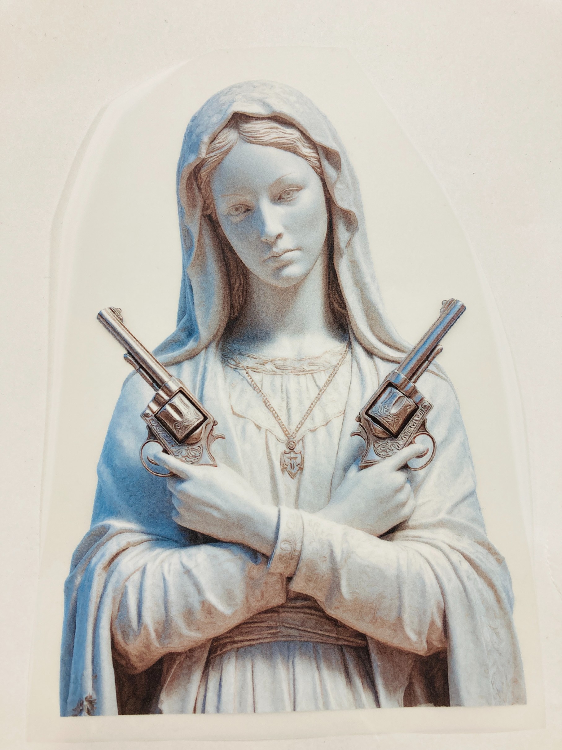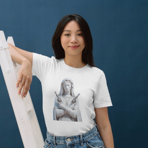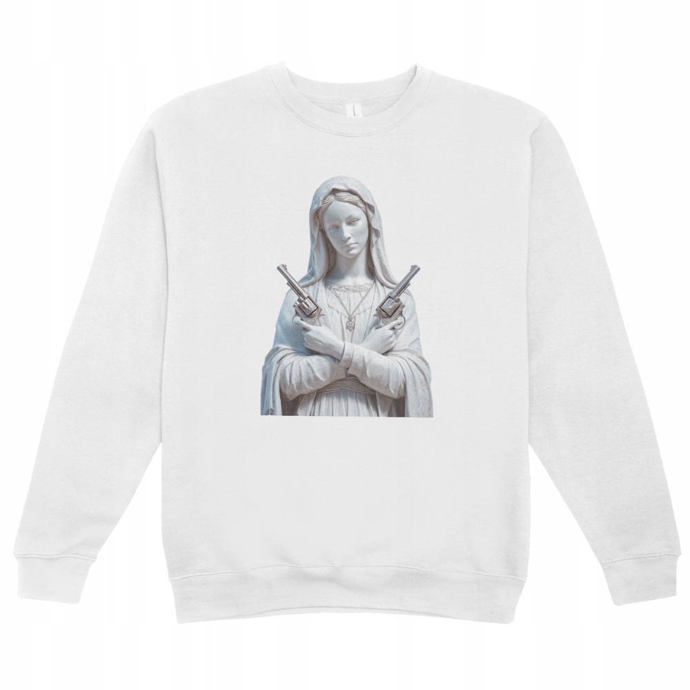 Oferujemy wysokiej jakości nadruk, naprasowankę na ubranie przedstawiającą postać Maryi z rewolwerami, idealną do personalizacji odzieży. Wykonana z trwałego materiału, nasza naprasowanka charakteryzuje się żywymi kolorami oraz szczegółowym designem, który z pewnością przyciągnie uwagę. Dzięki łatwej aplikacji, możesz szybko odmienić swój t-shirt, bluzę, torbę czy inne elementy garderoby, dodając im unikalnego charakteru. Naprasowanka jest odporna na pranie, co zapewnia długotrwały efekt. Zrób wyjątkowy prezent dla siebie lub bliskiej osoby. Nasz produkt to doskonały wybór dla osób z poczuciem humoru i nutką sarkazmu, które pragną wyróżnić się w tłumie.